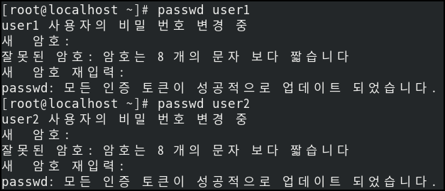 ▲ 간단한 암호 입력 시 경고는 나오지만, root 사용자가 암호를 지정해줄 경우 간단한 암호도 지정 가능하다.