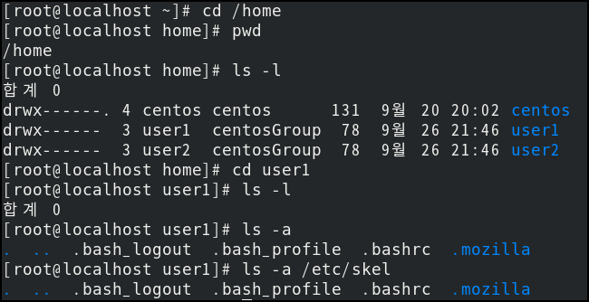 두 디렉터리에 동일한 파일이 들어 있는것을 알 수 있다. 즉 새로운 사용자를 생성하면 기본적으로 숨김 파일로 제공되는 파일이 존재한다. 해당 사용자의 홈 디렉터리 기본 설정은 ' /home/사용자이름 ' 으로 지정되며, /etc/skel 디렉터리의 모든 내용을 사용자의 홈 디렉터리에 복사하는 작업이 발생한다.
